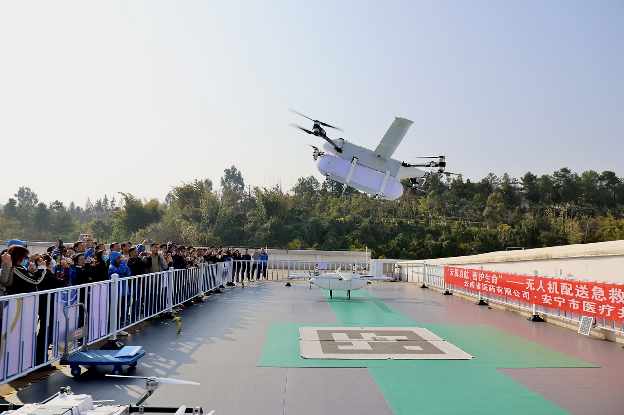 3月5日,云南省医药有限公司(以下简称省医药公司)圆满完成云南省无人机药品配送的首飞任务。此次飞行从昆明市呈贡区起飞,跨越38.8公里城市空域,将急救药品安全送达安宁市第一人民医院,标志着云南省应急医疗物流保障正式迈入“陆空协同”的智慧配送时代,为抢救生命开辟出真正的“空中绿色通道”。